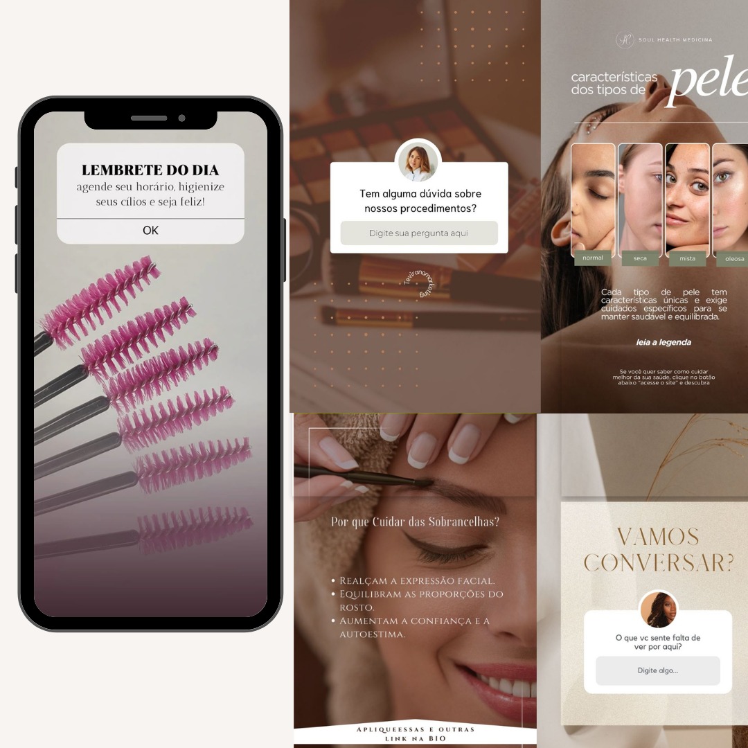 O Kit Estética PRO foi criado especialmente para profissionais da beleza que desejam transformar seu Instagram em uma vitrine de autoridade e vendas. Desenvolvido com base em três pilares estratégicos — Estética, com templates de design moderno e alinhado ao universo da beleza; Valor, com textos prontos que geram conexão, autoridade e valorizam seus serviços; e Atração, com conteúdos pensados para chamar atenção, engajar e converter seguidores em clientes — o kit é ideal para quem quer praticidade e resultado. Você não precisa ser designer ou entender de marketing: é só escolher, personalizar e publicar.